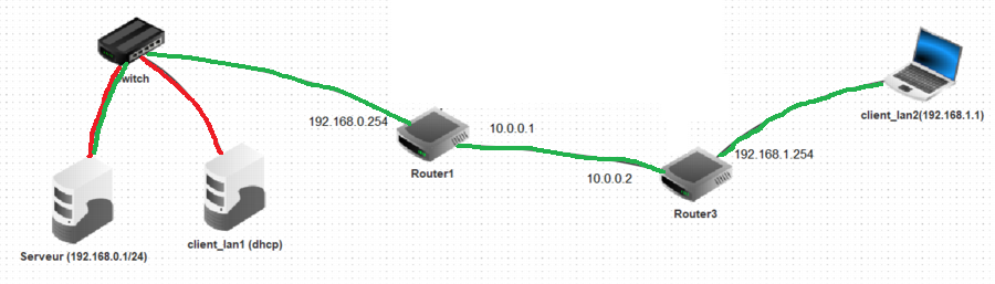 Vous savez que ce n'est pas le routage (Test1), ni la connexion physique entre le client_lan1 et le routeur1 (Test 2). Quelle est la différence entre le Test 2 et le Test3? Le client_lan1 sait-il où envoyer un paquet à destination de l'interface du routeur1 10.0.0.1, pour le savoir faîtes le Test4: