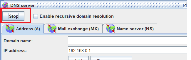 Sur le Serveur, ouvrez le logiciel DNS Server ( entouré en rouge ci-dessous) , cliquez sur Stop pour arrêter le service