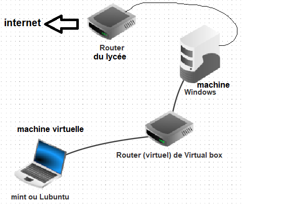 Coté adapter 1 ( la machine virtuelle est reliée via un routeur virtuel de virtualBox à la vraie carte réseau de la machine Windows 10; la vraie carte réseau est en communication avec le routeur du lycée via une liaison ethernet)