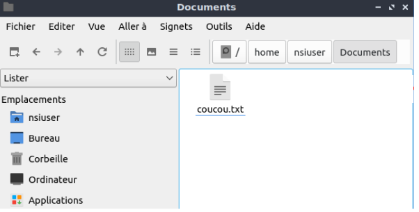 - A l'intérieur du dossier Documents, vous devez voir le fichier texte coucou.txt