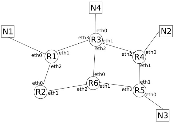 Le réseau N1 est maintenant relié à d’autres réseaux locaux (N2, N3, N4) par l’intermédiaire d’une série de routeurs (R1, R2, R3, R4, R5, R6) :