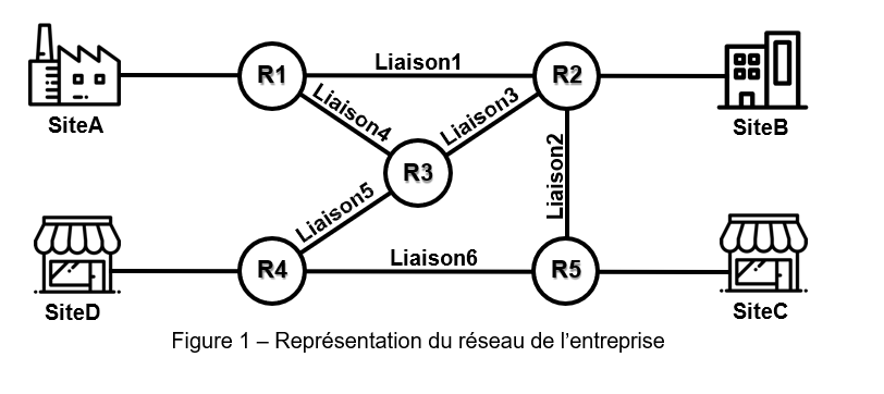 Le réseau d’une entreprise dispose de quatre sites (SiteA, SiteB, SiteC et SiteD) et de cinq routeurs (R1, R2, R3, R4 et R5). La figure 1 en donne une représentation
