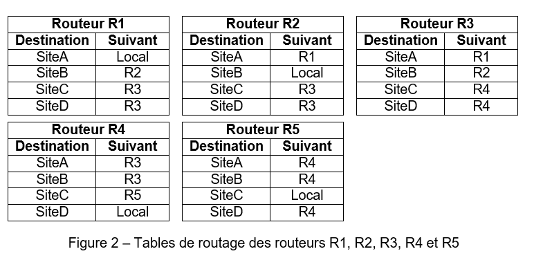 - Dans un premier temps, les tables de routage des routeurs sont configurées manuellement (voir figure 2). Indiquer le chemin suivi par les paquets lorsqu’une information est envoyée de SiteB à SiteC.
