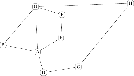 On schématise ce réseau par un ensemble de routeurs (appelés A, B, C, D, E, F, G et H) chacun associé directement à un réseau du même nom :