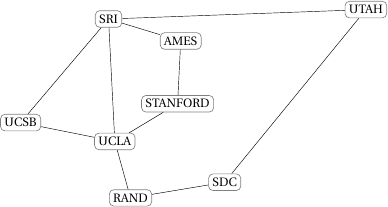 SRI : Stanford Research Institute AMES : Ames Research (NASA) UCSB : Université de Santa Barbara UCLA : Université de Los Angeles STANFORD : Université, Silicon Valley RAND : Research And Development SDC : System Development Corporation (Santa Monica) UTAH : Université de Salt Lake City |
