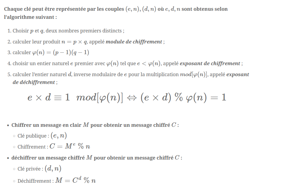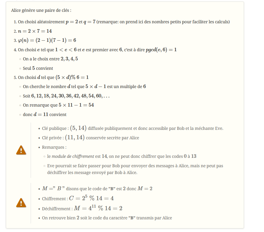 Pour que le code soit difficile à décrypter, il faut de très grands nombre premier ce qui ne sera pas le cas de l'exemple pour faciliter les calculs: