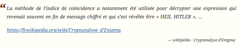 Remarque : Alan Turing a utilisé cette technique qu’on appelle indice de coïncidence pour rechercher un motif connue dans les messages allemands cryptés avec Enigma